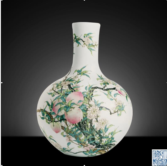 - 藏品描述:乾隆粉彩九桃天球瓶是乾隆早期的作品,其畫工、顏色、款識均與乾隆盛期的作品有所區別,同時又與雍正時期的作品存在諸多相似之處。