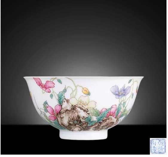- 藏品描述:此盌器形雅正,弧壁渾圓略撇,胎質細密,均淨如雪。從景德鎮禦窯跋涉上送京師,宮中妙畫琺瑯彩,外壁寫生虞美人,黃自矜持、白怯羞緋、紅恃嬌縱、紫尚雅風,翠葉間,纖花或含蕾、或盛綻,曲莖搖曳微風中,石半掩、蝶縈繞,渲染描繪細膩如生。盌心加綴三多瑞果,更顯清朗秀逸。足底雙方框內藍料書「乾隆年製」四字宋體款。乾隆琺瑯彩,瓷胎畫琺瑯是清代皇室自用瓷器中最具特色、最為精美的彩色瓷器。