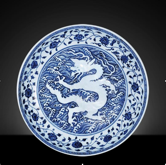 - 藏品描述:本件大盤形制規整,大口微斂,弧腹廣底,淺圈足,為明初大體量盤式的經典造型。通體青花描繪紋飾,內壁繪牽連纏繞的纏枝花卉十二朵;外壁繪奔龍四條,其間以壬字雲紋間隔。盤心青花雙圈內繪奔涌的海濤為地,再以留白技法淺刻鬚爪鱗片表現一半側面立龍,僅雙目龍睛以青花點繪,身旁圍繞的火焰亦以留白技法表現,在青花海水地子的波濤襯托下,使得龍躍於淵,極具神韻。