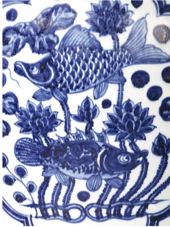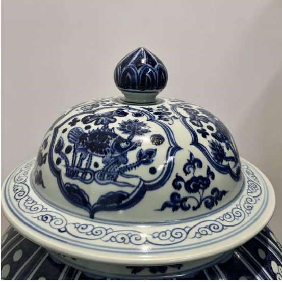 罐身主題紋飾為魚藻圖,以青花技法描繪鯖、鮊、鯉、鱖四種祥魚嬉戲於水藻間,寓意「年年有餘」。魚兒形態生動,水藻隨波搖曳,藍白相映間營造出波光瀲灩的動態意境。畫工細膩如宋人工筆,魚鱗須爪一絲不苟,浪花紋以淺藍細描,展現「水中見筆」的高超技藝。