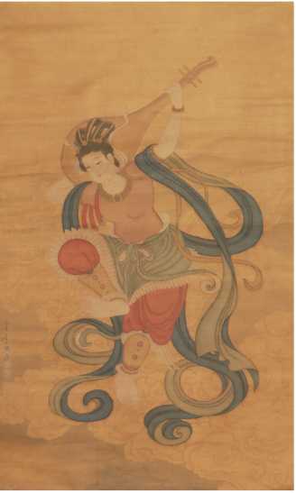 此拍品張大千所繪《敦煌飛天圖》,此圖見於莫高窟112窟的《伎樂圖》,為該窟《西方淨土變》的一部分。 圖中伎樂天神態悠閒雍容、落落大方,體態豐盈,上身裸露,琵琶置於背後,伴隨著仙樂翩翩起舞,舉足旋身,使出了反彈琵琶絕技時的霎那間動勢,在張大千的筆下將這一動勢展現的惟妙惟肖。 人物造型豐腴飽滿,線描寫實明快、流暢飛動,一氣呵成,天衣飄颶,有吳帶當風的韻致,把唐代佛教繪畫民族化的特色展現的淋漓盡致。 敷彩以名貴天然礦物料,使整個人物顯得更加典雅、嫵媚,活靈活現,令人賞心悅目。 反彈琵琶實際上是邊奏邊舞,勁健而舒展,迅疾而和諧,把高超的演奏技藝和絕妙的舞蹈技巧優雅迷人地集於一身,為大唐文化在歷史添上了濃重的一筆,也是張大千所繪敦煌壁畫中的代表傑作。 敦煌壁畫的線條和色彩對張大千後期人物影響很大,吸取了從北魏到元各時期的人物形態,和其早期學唐寅、仇英、改琦等人較為單一的仕女畫風格拉開了距離,形成了雍容淡雅、設色豔麗的個人風格。敦煌之行是其藝術生涯中的重要轉捩點。 而此幅拍品正是張大千在敦煌期間的代表作品之一,具有非常珍貴的收藏意義,其收藏價值不可估量,尤為珍貴!