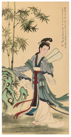 《仕女圖》是張大千代表作之一,圖中仕女持扇站立在竹林旁,女士細目小口,面容嬌俏,身形比例適當,體態輕盈婀娜,形態逼真,髮髻高挽,勾染細緻,頗有質感,眼波脈脈,衣紋流暢飄逸,線條精準爽健,造型上雍容華貴,嬌媚高傲,健康秀美,詮釋了東方女子特有的溫柔與典雅氣質。