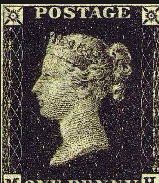 「黑便士」郵票上印著英國維多利亞女王年輕時的側臉,圖案上方印有「POSTAGE」(郵資)字樣,下方則是表示面額的「ONE PENNY」(一便士)字樣。