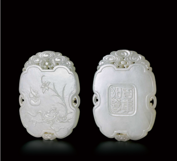 玉質潤澤,雙面雕工,一面琢柿子、如意、百合花,取其諧音而組成“百事如意”之美意,背面雙線方形開光內篆書:百事如意。特別是字體下方人為琢刻砂地,以仿印章之效果,別具匠心。