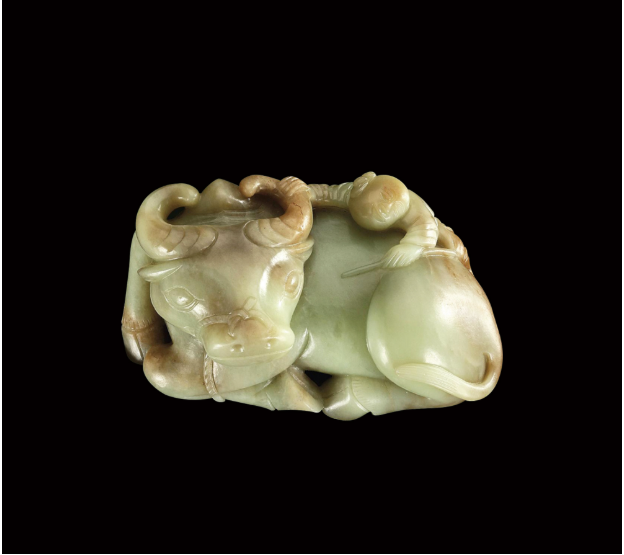 童子牧牛玉雕自宋代開始流行,既蘊含著人們對田園牧歌生活的嚮往,亦展現了勤勞樸實的勞動精神,故廣泛應用於各類玉質擺件、把件或飾品中。本品即為其中之一,由大塊上乘青白玉圓雕而成,玉質光潔瑩潤,色澤柔美,十分難得。水牛身形肥碩,臥地回首,牛角彎彎,溫順馴和。童子伏於牛背之上,圓頭圓腦,嬉笑開懷,一手抓牛角,一手持葦杆,腿腳登爬狀,一副無邪頑皮的樣子。整件雕琢自然生動,線條瀟灑流暢,牧童、水牛均得其神,包漿醇厚,由內而外的細潤光澤散發出玉石本身的華彩和時間的沉澱,令人愛不釋手。