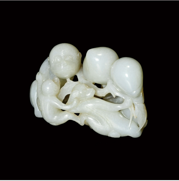 擺件選用碩大白玉所製,玉質精潤,潔白細膩,料性極佳,望之散發油脂光澤,手感潤滑,包漿圓熟。圓雕三猴捧桃獻壽,中間公猴較為年長,體型較大,曲身坐立,額部平順,額前三道皺紋深邃細長,眼窩深,管鑽圓眼,直鼻微挺,鼻孔細節清晰形象,薄唇緊閉,頜部前凸,小耳帖腦,面露機警之態。身形圓潤,四肢修長,上臂粗壯圓實,右手舉起撓耳,左手垂下前伸摟住身前的小猴。