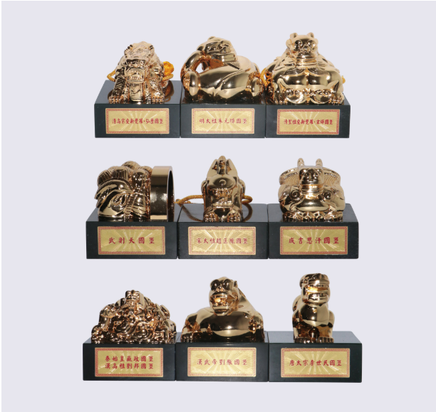 2012年中國為了讓五千年文化永久傳承,特批将国家囤积的一批上等和田青玉铸造成十大帝王国玺。十大帝王國壐每套共九尊(秦始皇和漢高祖共擁有一尊),每尊一公斤優質新彊和田青玉(璽基)和七佰克重貴金屬(璽鈕),由北京首都博物館監制,國家限量發行。每套配有首都博物館出具的監制証書,國家權威机構出具的和田玉檢測報告和貴金屬檢測報告,并附有國家級相關專家的品鍳報告。中華十大帝王和田青玉包金國璽是一套中國現代難得一見,獨具一格的藝術品,具有無可限量的收藏價值。