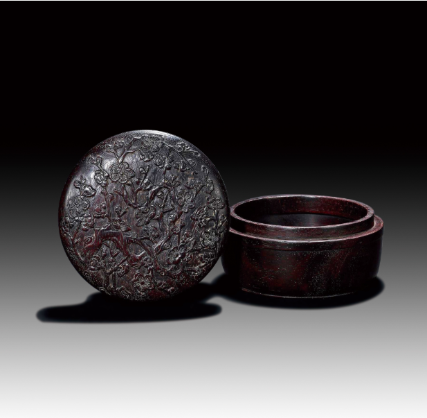 此件紫檀香盒呈扁圓形,紫檀木名貴珍稀,成材極難,加之材質緊密,不易奏刀,因此其雕刻多以良工為之。此紫檀香盒色澤紅紫近黑,靜謐厚重。盒為圓形製,子母口蓋,緊密天成,歷經百年磨摩,包漿瑩亮,做工規整,器型端正,當屬文人雅士香盒之上品。