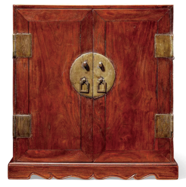 此箱較大,書箱黃花梨製,包漿自然,方角式樣,一封書,硬擠門,外形簡潔俐落,紅潤有澤。採用落堂起鼓工藝。兩開門,紋理呈對稱性,為一木對開,選料精良。門框內沿壓一周線條,工藝考究,正面鑲嵌長方委角銅面葉、合頁和鏤空吊牌,門內中央安抽屜架和兩具抽屜,抽屜臉亦精心選材,木紋連貫流暢,底承壸門式矮座。