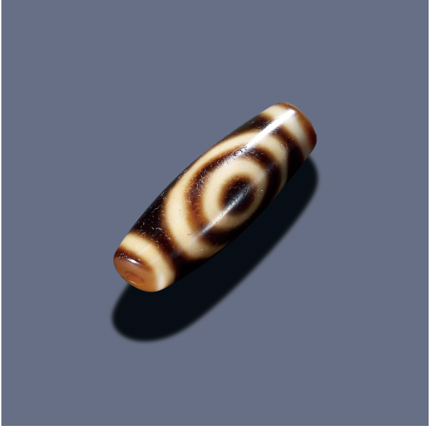 天珠對孔長約32.2mm,珠體最大直徑約11.7mm,孔口直徑分別為2.1mm和2.3mm,重6克。珠體呈圓柱形,中間略粗,逐漸向兩頭收細,兩端斜向截平,打磨光滑。珠體風化紋分佈細密,包漿潤亮,略有因表層晶體疏鬆而形成的沁線與晶體脫落,更增添厚重年代感。珠體表面大部分被蝕染呈黑色,色澤深沉,其間有乳白近牙黃色相間的紋飾;在珠體兩端臨近端部位置分別蝕染有一圈乳白近牙黃色的縱向圓圈紋環繞著珠體表面,在兩條縱向圓圈紋之間的珠體上分別蝕染有兩個位置相呼應的橫向圓圈紋,即俗稱的“眼紋”,其間有兩條乳白近牙黃色呈“Z”形的蝕線將兩個“眼紋”關聯起來,形成“對立且統一”的組合關係,即俗稱的“如意雙眼”紋飾。