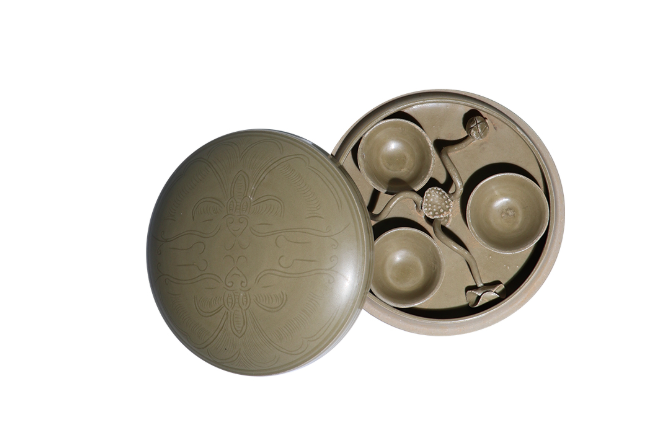 越窑是中國古代南方青瓷窑。窑所在地主要在今浙江省上虞、餘姚、慈溪、寧波等地。生產年代自東漢至宋。晚唐至北宋初是越窑工藝最精湛的時期,技藝不斷精進,達到頂峰,所燒青瓷代表了當時青瓷的最高水準。是當時的第一名窑,也稱“秘色窑”。唐代越窑青瓷已很精美,博得當時詩人的讚美,如顏況“越泥似玉之甌”,許渾“越甌秋水澄”,皮日休“邢人與越人,皆能造瓷器,圓似月魂墮,輕如雲魄起”,陸龜蒙“九秋風露越窑開,奪得千峰翠色來”等。五代吳越時越窑瓷器已“臣庶不得用”,作為吳越王錢氏御用及貢品。本品滿釉,釉層薄而勻,明顯與唐代越窑不同。本品胎體輕薄,造型秀美,釉層透明瑩潤,剔刻精彩,堪稱越窑粉盒精品。