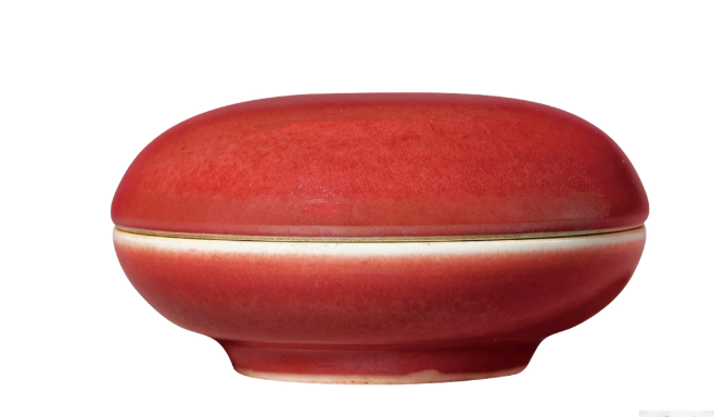 本品呈扁圓形,蓋面與盒身以子母口相合。胎質潔白堅實,外壁滿施豇豆紅釉,釉面光潔滋潤,盒身散佈苔點,蓋面片片淺色斑塊,與紅色交相輝映,如紅霞掩現朝霧之中,隱泛綠氤,釉色變化神妙無方,可謂「滿身苔點,泛於桃花春浪間」,淡雅宜人。底落「大清光緒年製」六字三行青花楷書款。