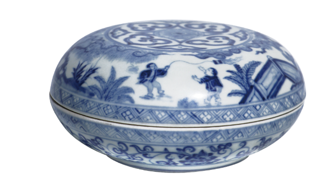 整個器物構圖嚴謹,胎釉精良,釉層厚腴,雖較為繁密但不零亂,畫法生動隨意,古拙有童趣。底足雙圈內書「大明成化年製」六字二行官窑款識。展這種庭院嬰戲圖是自宋代世俗文化興起以來一直流行的藝術題材之一。嬰戲圖是明清瓷器裝飾紋樣之一。嬰戲圖始於唐朝長沙窑瓷器,而盛於明清,特別是到了明中後期,嬰戲圖開始流行,畫面也比以前更加豐富多彩,由於明代早期受青花料的限製,人物圖案不易刻畫,而從明中期開始,青花料有了更換,變得易於刻畫圖案的細微之處,從而推動了嬰戲等紋飾的發展。繪畫技巧普遍提高,畫面的層次感增強。在人物的畫法上,或雙勾填染或淡描線繪,童子的後腦突出,身體修長,上衣和下褲完全用青花的色彩來區分。
