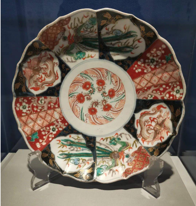 - 鼎盛期(17 世紀末 – 18 世紀初):隨著歐洲「中國風」(Chinoiserie)盛行,伊萬里瓷開始大規模出口歐洲。為迎合歐洲貴族審美,逐漸推出「金彩五彩瓷」—— 以紅、藍、黃、綠等色彩為基底,大量運用金箔裝飾,紋飾繁密華麗,題材除傳統東方元素(龍鳳、花鳥)外,還加入歐洲風格的卷草紋、盾形紋,器型也新增歐式湯碗、咖啡杯、花瓶等,成為歐洲宮廷與貴族收藏的熱門品。